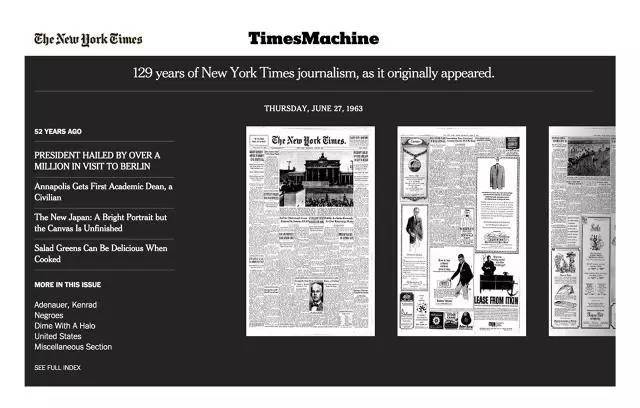 品牌们不妨借鉴出版商的例子,后者首开先河,设计出高效的数字化档案。在这方面,《纽约时报》树立了不错的榜样。与其任由过期刊物积尘,他们推出了“时光机”(Times Machine)栏目,释放旧刊内容的价值,让历史访谈和专题报道重新浮出水面,为当下的新闻故事提供背景资料,延长读者停留时间,建立老牌“档案记录报”强大的品牌故事。