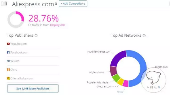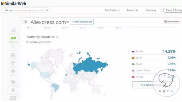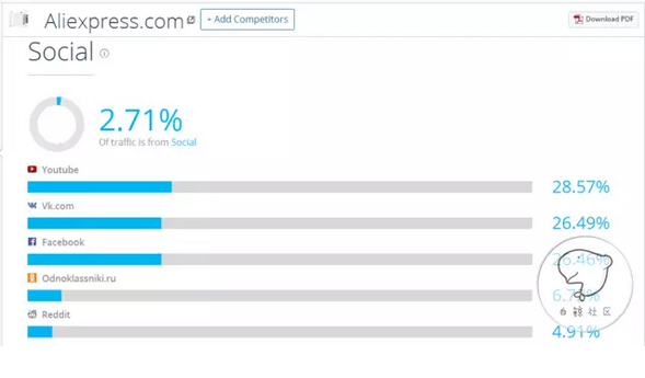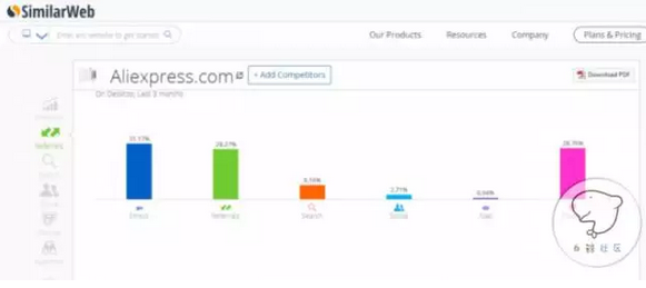 如果你想查看感兴趣的主页的粉丝分布你可以使用socialBaker和 Facebook 自带的audience insight工具。如果想查看感兴趣的网站的流量来源,你可以使用similarweb工具。如利用similarweb查看Aliexpress的流量来源(如下图所示):
